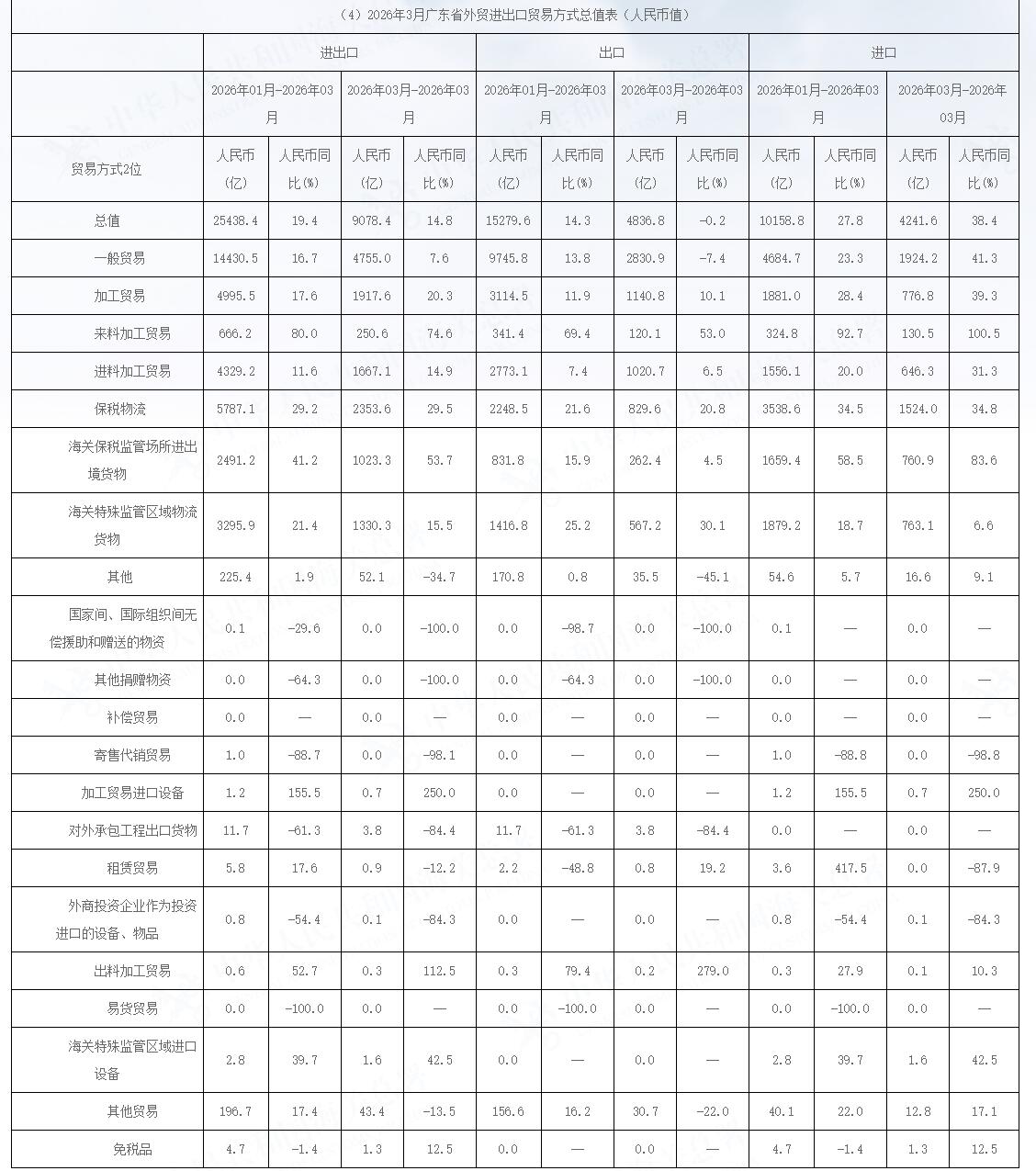 2026年3月广东省外贸进出口贸易方式总值表(人民币值)